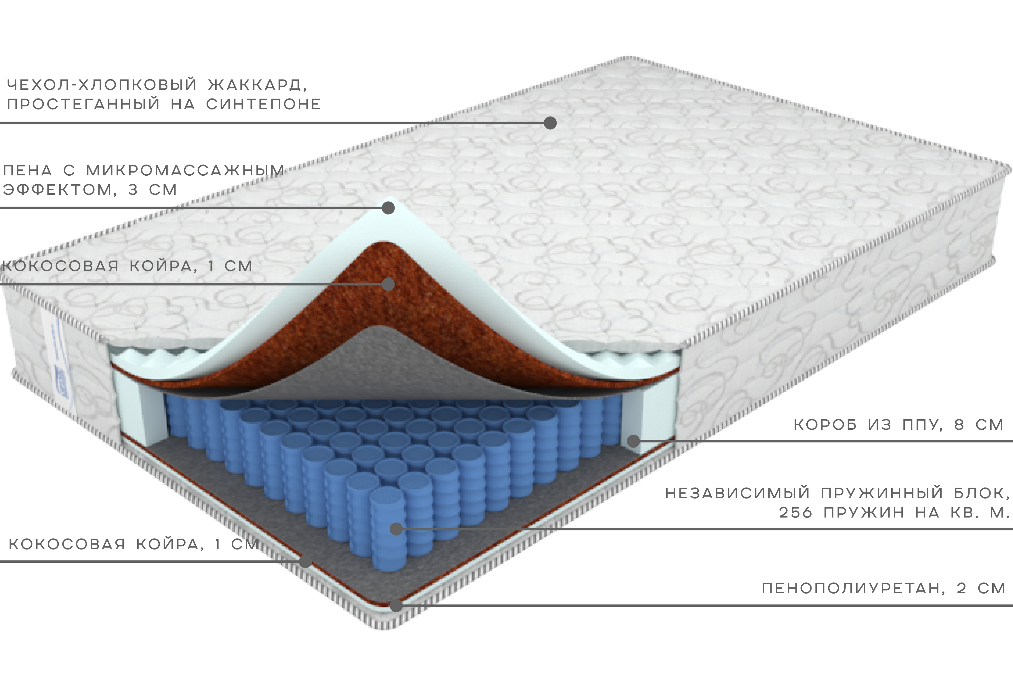 С обеих сторон расположен слой латексированной кокосовой койры, придающий матрасу жёсткость, прочность и устойчивость к нагрузкам.