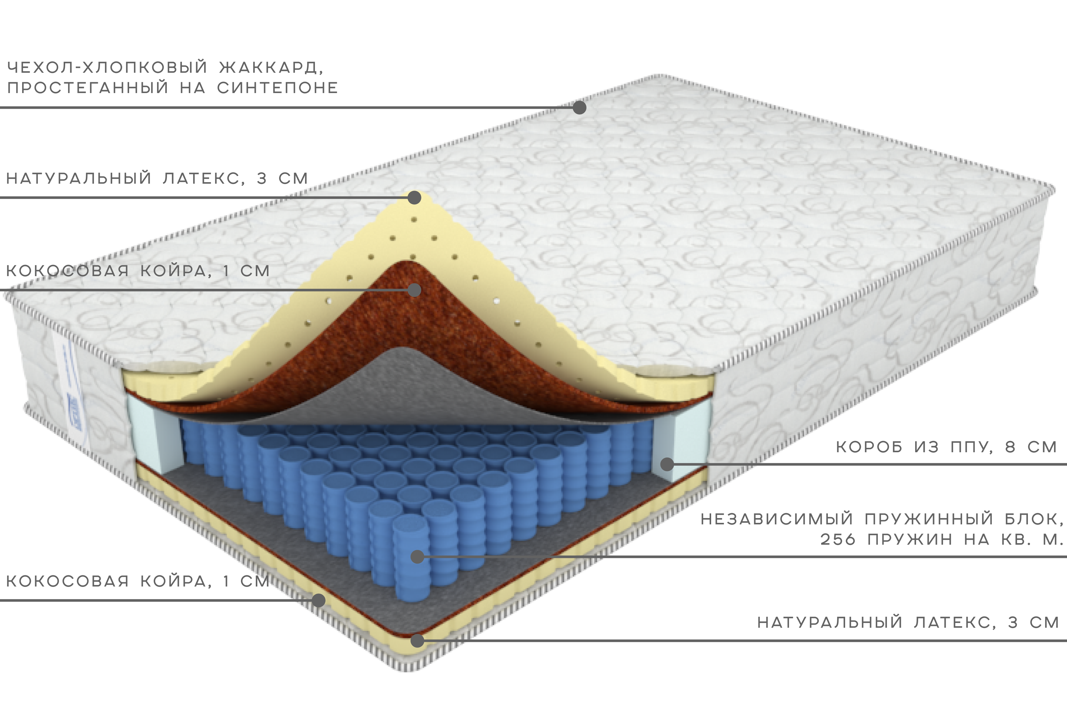 Для защиты наполнителей и увеличения срока службы используется прочный термовойлок, изолирующий пружины от мягких слоёв.