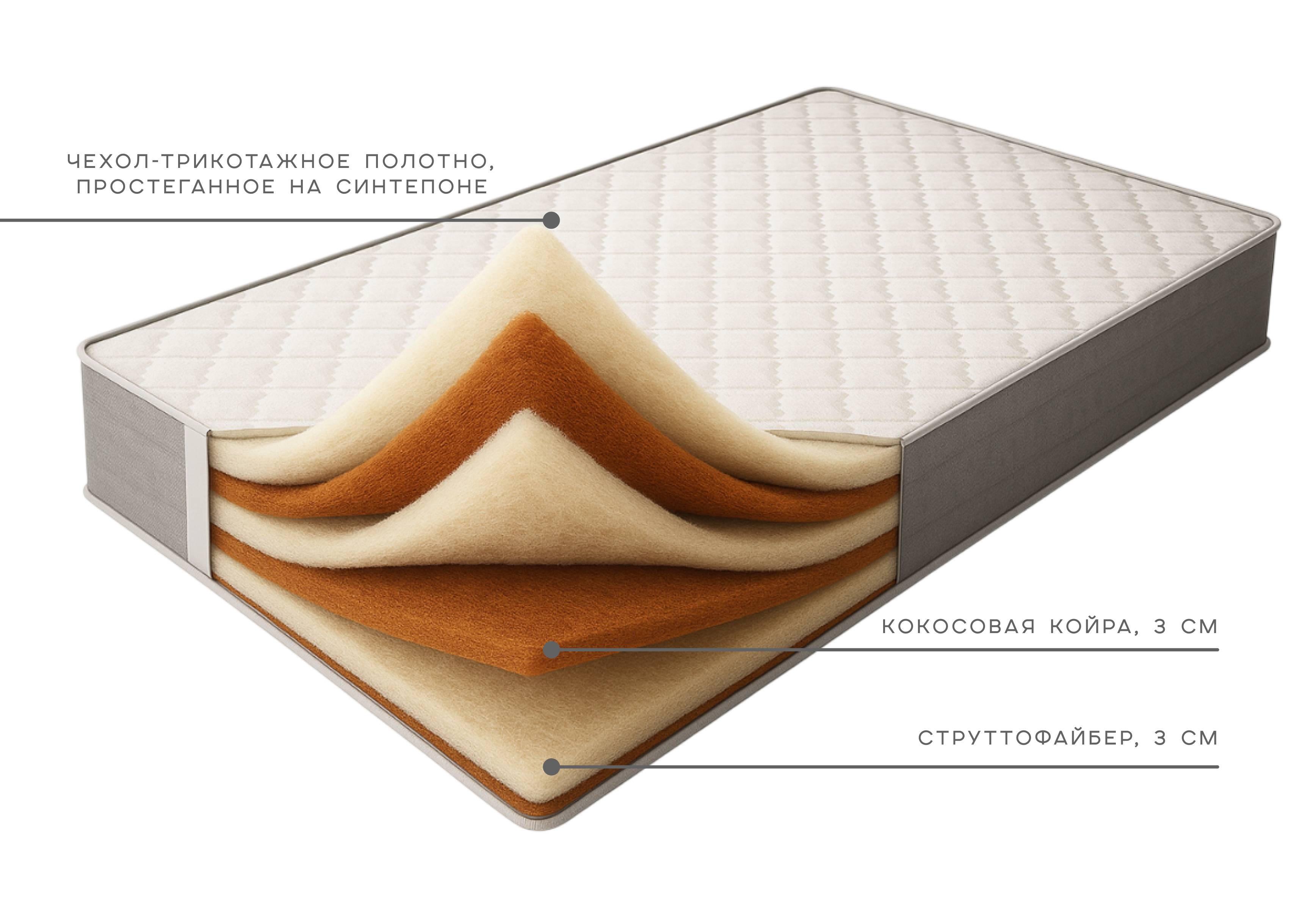 Основу конструкции данного матраса составляют чередующиеся слои латексированной кокосовой койры и современного волокнистого материала – струттофайбера.