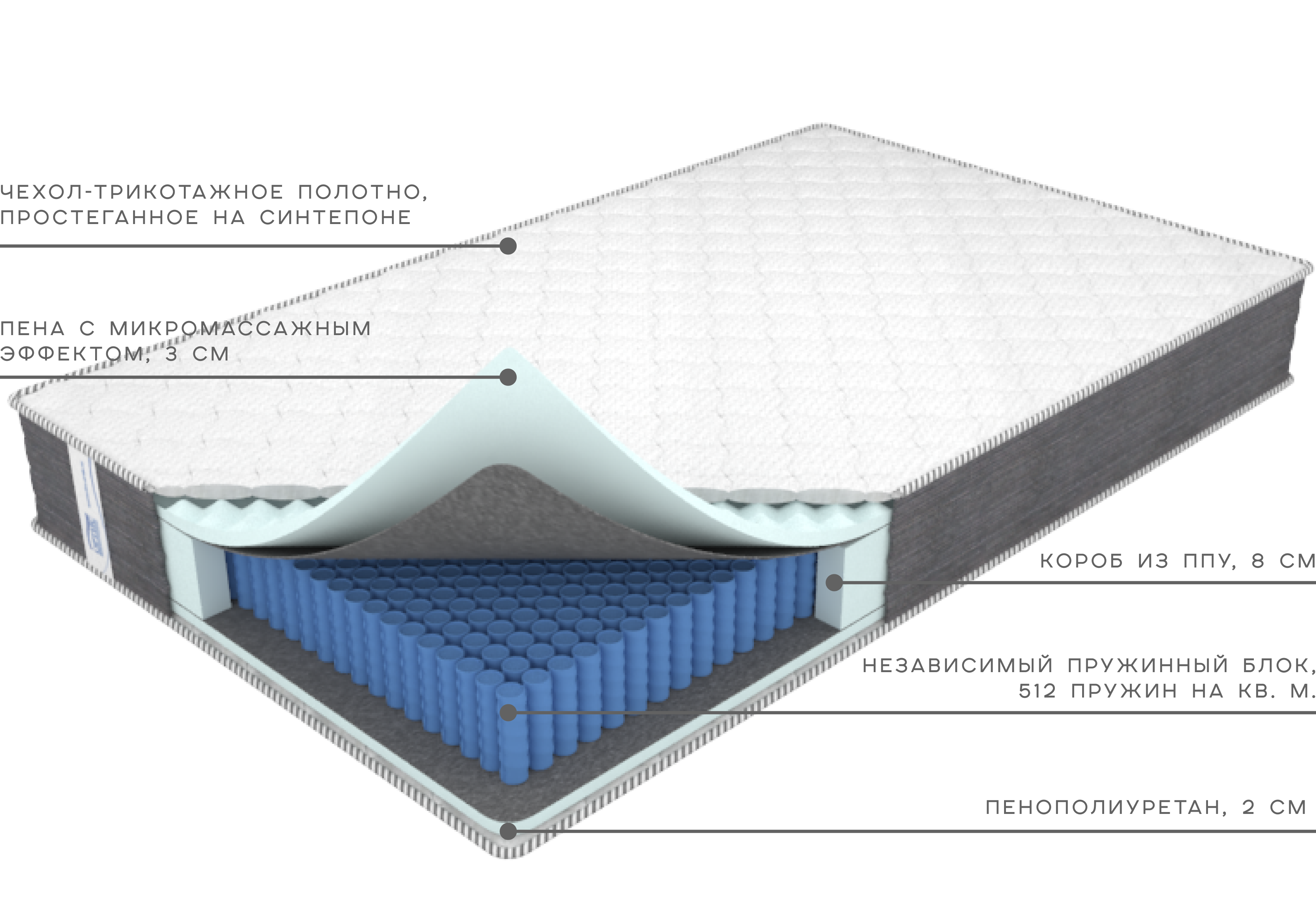 Усиленный короб из ППУ по периметру сохраняет форму матраса и предотвращает деформации краёв.