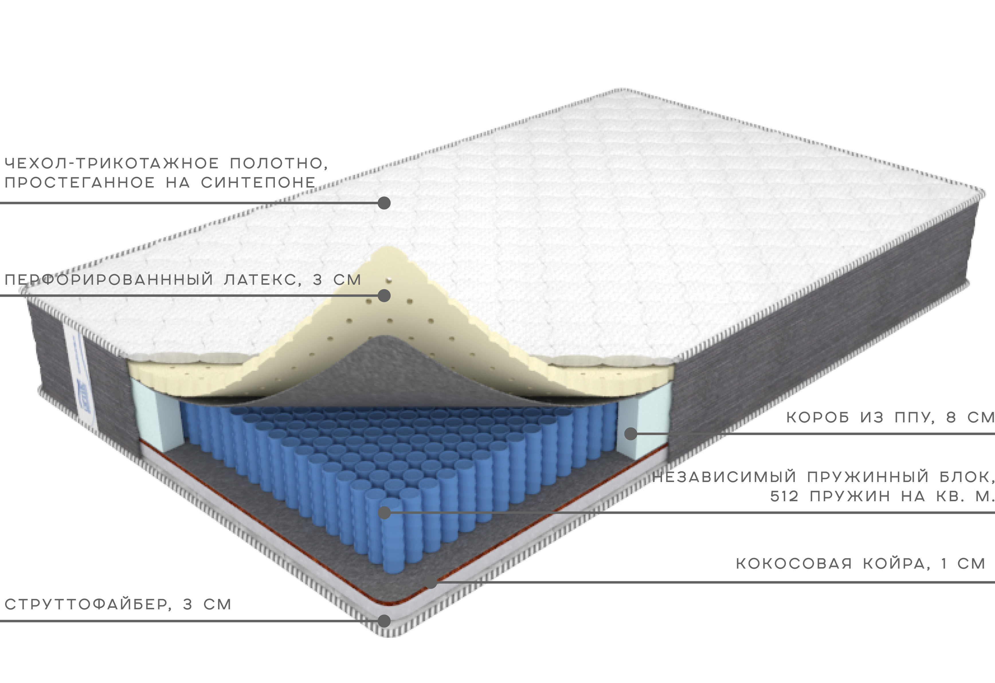 Короб из ППУ по периметру сохраняет форму матраса и предотвращает проседание краёв.